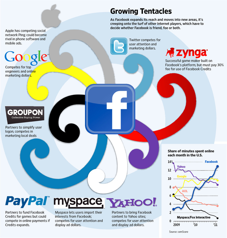 這個(gè)7歲的公司像上弦了一樣無(wú)時(shí)無(wú)刻的在招聘員工,加入新的社交功能。它的成長(zhǎng)嚴(yán)重傷害到了老牌媒介公司例如 Yahoo.inc、Google.inc 也包括其他建立在網(wǎng)絡(luò)上的小公司。Facebook 如今有著超過(guò)6億的用戶(hù),公司價(jià)值500億,以至于翹走不少Yahoo、Myspace等等站點(diǎn)的廣告。