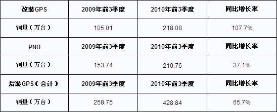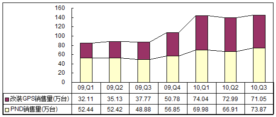 賽迪顧問(wèn)市場(chǎng)監(jiān)測(cè)數(shù)據(jù)顯示,2010年前三季度中國(guó)改裝GPS市場(chǎng)實(shí)現(xiàn)總銷量218.08萬(wàn)臺(tái),比2009年同期增長(zhǎng)107.7%,而與此同時(shí),2010年前三季度中國(guó)PND市場(chǎng)實(shí)現(xiàn)總銷量210.76萬(wàn)臺(tái),比2009年同期增長(zhǎng)37.1%。