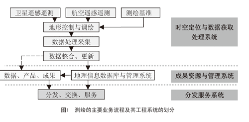 以上劃分原則對一個系統(tǒng)工程(體系)的組織實施來說,既科學(xué)合理,又清晰實用。當然,除了“工程系統(tǒng)”之外,還分別有若干“技術(shù)系統(tǒng)” 進行支撐,但這些不同的技術(shù)方法、實現(xiàn)的手段以及所需要的軟硬件環(huán)境條件都將融入到各個工程系統(tǒng)的建設(shè)之中,在組織實施時體現(xiàn)。這些原則同樣適用于對“信息化測繪體系”的剖析、分解,應(yīng)該加以借鑒。