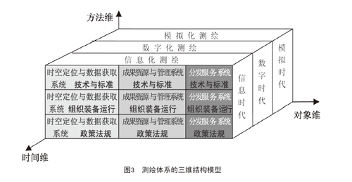 圖3可以理解為“測繪體系”的三維結(jié)構(gòu)概念模型,它完整地表達了測繪體系的發(fā)展階段、體系構(gòu)成、實現(xiàn)方法及其之間的內(nèi)在關(guān)系。