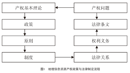 地理信息資源產(chǎn)權(quán)政策與法律也存在著密切聯(lián)系,其中政策是制定法律的依據(jù)與指導(dǎo);法律是政策的具體化、條文化與規(guī)范化。例如地理信息資源產(chǎn)權(quán)政策與法律的制定流程大致如下圖1所示。