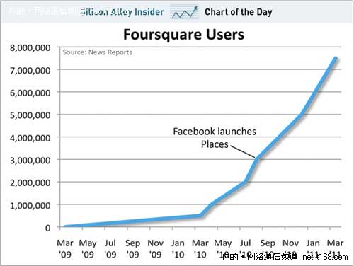 去年,F(xiàn)oursquare的發(fā)展可謂是一波三折。先是被各種并購(gòu)的傳聞所包圍,另外就是其由于用戶規(guī)模過(guò)于狹小而讓業(yè)內(nèi)對(duì)其的未來(lái)懷有相當(dāng)?shù)牟淮_定性,接著就是Facebook發(fā)布Places,這更為Foursquare的未來(lái)蒙上了一層陰影。但轉(zhuǎn)機(jī)似乎在此發(fā)生了,相關(guān)的分析稱,正是由于Facebook Places的發(fā)布,導(dǎo)致了此后Foursquare在去年下半年的飛速增長(zhǎng)。莫非是巧合嗎?