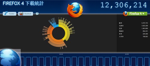 為了記錄這一歷史性的突破,火狐特別制作了一個(gè)動(dòng)態(tài)網(wǎng)頁,供網(wǎng)友實(shí)時(shí)看到全球的下載盛況:http://glow.mozilla.org/