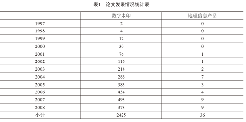 從上表中可以發(fā)現(xiàn),數(shù)字水印技術(shù)從2000年開始,越來越受到人們的關(guān)注,發(fā)表論文數(shù)量逐年遞增,到2007年達(dá)到最多共有493篇。然而,這與數(shù)字水印在地理信息產(chǎn)品中的應(yīng)用論文數(shù)量形成鮮明的反差。從2001年發(fā)表第一篇關(guān)于數(shù)字水印技術(shù)在地理信息產(chǎn)品中的應(yīng)用論文開始,到了2007年一年才發(fā)表9篇。從總數(shù)來看,數(shù)字水印的論文從1997年到2008年一共發(fā)表了2425篇,而數(shù)字水印技術(shù)在地理信息產(chǎn)品中的應(yīng)用論文僅有36篇。由此看來,數(shù)字水印技術(shù)在地理信息產(chǎn)品中的應(yīng)用程度還遠(yuǎn)遠(yuǎn)不夠,有待于進(jìn)一步進(jìn)行深入的應(yīng)用研究。