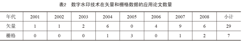從上表中可以看出,數(shù)字水印技術(shù)在矢量數(shù)據(jù)方面的論文數(shù)量明顯要多于數(shù)字水印技術(shù)在柵格數(shù)據(jù)方面的應(yīng)用論文數(shù)量。