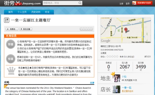 一坐一忘麗江主題餐廳在街旁網的店長頁面(3sNews 配圖)