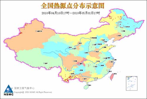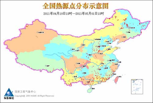 遙感顯示,今年4月中旬至5月初,全國(guó)火點(diǎn)共572處,較2001年以來(lái)最大年份(2003年)同期偏少43處,比同期平均值偏多34%,屬近11年來(lái)偏多年份。其中華北、淮南地區(qū)最多。