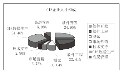 我國(guó)GIS 企業(yè)數(shù)量和產(chǎn)值增長(zhǎng)很快。截至 2005 年,我國(guó)從事 GIS 軟件和應(yīng)用開發(fā)的企業(yè)已超過(guò) 500 家,總產(chǎn)值達(dá)到 40 億元至 50 億元。我國(guó)地理信息系統(tǒng)產(chǎn)業(yè)已經(jīng)初步形成。地理信息產(chǎn)業(yè)的發(fā)展必然帶來(lái)人才的巨大需求。根據(jù)武漢大學(xué)“全國(guó)GIS專業(yè)辦學(xué)狀況及社會(huì)需求”社會(huì)調(diào)查實(shí)踐成果報(bào)告中的數(shù)據(jù)顯示, GIS企業(yè)的市場(chǎng)沒(méi)有龐大的市場(chǎng)銷售渠道和日化、電子產(chǎn)品龐大的消費(fèi)量,故而市場(chǎng)銷售人員(3.73%)和管理人員(5.98%)偏少;另外技術(shù)是企業(yè)的生命線,急需的軟件平臺(tái)開發(fā)(24.9%)和工程應(yīng)用開發(fā)(22.41%)的人才;同時(shí)GIS自身的特點(diǎn),對(duì)數(shù)據(jù)處理與數(shù)據(jù)生產(chǎn)(34.40%)的人才的需求也相對(duì)較大。企業(yè)對(duì)測(cè)繪與地理信息人才需求的構(gòu)成如下圖: