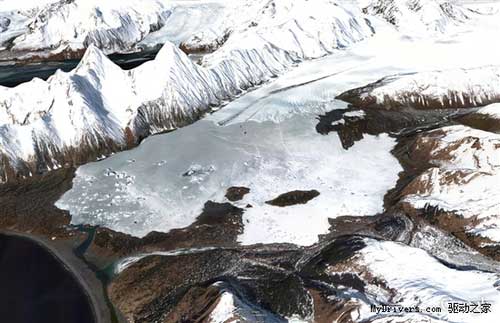 如果你想看看一些清涼的地方,Google同樣貼心地提供了很多去處的高清照片,比如下邊是阿拉斯加州奇奈峽灣國家公園(Kenai Fjords National Park)的大熊冰川(Bear Glacier)。在這張四月份剛剛拍攝的航空照片上,可以清楚地看到冰川、冰塊以及融化后的河水、殘骸等等。這塊冰川來源于哈丁冰原(Harding Icefield),美國境內(nèi)最大的冰原。