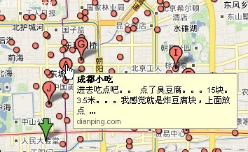 今天Google Maps升級(jí)了,只要鼠標(biāo)懸停,即可顯示出摘要,在找到你想去吃的店之后,再點(diǎn)擊,則出現(xiàn)跟以前一樣的泡泡窗口,可以查看更多詳細(xì)信息包括電話、地址、照片、評(píng)價(jià)等等。有時(shí)你搜索一個(gè)比較大眾化的東西,可能會(huì)得到一大片結(jié)果,比如搜索“成都小吃 北京”(如上圖),而以前你要一個(gè)一個(gè)點(diǎn)擊,在彈出的泡泡窗口里看每家店叫什么。