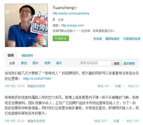 在第一時(shí)間,街旁網(wǎng)聯(lián)合創(chuàng)始人楊遠(yuǎn)騁在其微博予以澄清(3sNews 配圖)