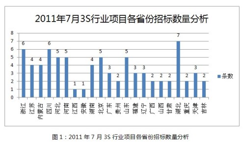 以上是2011年7月份由3sNews整理發(fā)布的3S行業(yè)的招標(biāo)項(xiàng)目匯總,通過上面圖1統(tǒng)計(jì)圖表可以看出,本月3S行業(yè)項(xiàng)目地域分布較均勻,但還是可以看出浙江、四川、湖北三個(gè)省相對(duì)較多,與前兩個(gè)月情況基本一致。