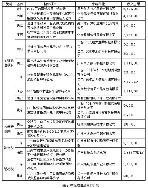本月中標(biāo)公告共計(jì)16條,其中測(cè)繪類2條,地理信息項(xiàng)目10條,儀器設(shè)備采購2條,遙感2條,具體項(xiàng)目名稱及中標(biāo)單位如表2所示。