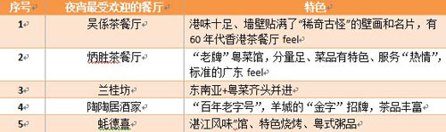 從大眾點(diǎn)評(píng)網(wǎng)手機(jī)的用戶(hù)可以看出,茶餐廳的“夜行者”依然很多。目前,晚間21點(diǎn)-23點(diǎn)最受歡迎的茶餐廳分別為:吳係茶餐廳、炳勝茶餐廳、蘭桂坊(粵菜)、陶陶居酒家,此外,以“風(fēng)味燒烤”為特色的蠔德喜也是榜上有名。