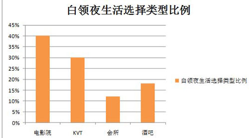 大眾點(diǎn)評(píng)手機(jī)客戶(hù)端數(shù)據(jù)顯示,作為有消費(fèi)能力的都市白領(lǐng)夜生活的選擇涵蓋了“看電影”、“KVT”、“桑拿會(huì)所”及“酒吧”幾大類(lèi),一線城市消費(fèi)方式基本相同。
