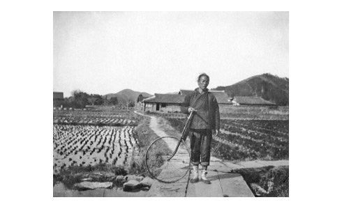 初以為照片中的男子拿著的獨輪是半輛自行車,后來才知那是測繪地圖時所用的測量輪。過去地方志上的地圖都是手繪的,精確度很低,而依據(jù)現(xiàn)代地圖測繪技術(shù)所測繪的寧波地圖,迄今所發(fā)現(xiàn)最早的是繪成于1883年寧波城廂圖。包括鄉(xiāng)村在內(nèi)的寧波府全圖,最早出現(xiàn)于1910年。所以,戴維斯百年前為我們留下的這幀照片,或許正是當(dāng)年測繪寧波府全圖時的情形。(水銀)