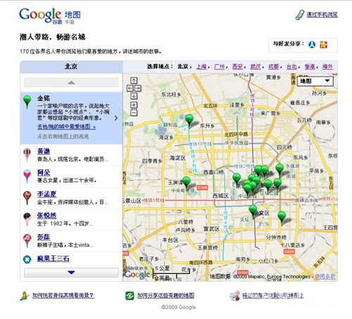 潮人地圖是谷歌地圖最新特色服務(wù)Favorite Places的中文版,F(xiàn)avorite Places列出了包括著名廚師、藝術(shù)家、滑板高手、甚至美國(guó)前副總統(tǒng)所喜歡的一些商戶,而潮人地圖則囊括了170名國(guó)內(nèi)各界時(shí)尚人物的推薦。