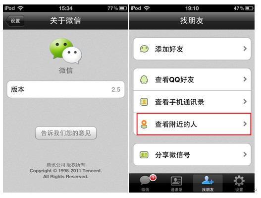 此外,QQ好友和手機(jī)通訊錄上大多數(shù)都是自己熟悉的朋友,微信的朋友關(guān)系網(wǎng)很大一部分是真實(shí)的朋友關(guān)系,國(guó)內(nèi)LBS用戶(hù)的使用習(xí)慣和國(guó)外還是有區(qū)別的,初期階段,不太習(xí)慣和陌生人玩LBS,在微信上,因?yàn)榇蠹叶际鞘烊?,由和熟人玩lBS發(fā)展到和陌生人玩LBS,就顯得更自然些,同時(shí)也不用擔(dān)心個(gè)人隱私的問(wèn)題。