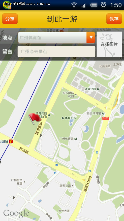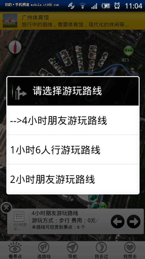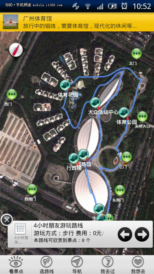小編嘗試點擊了一個景區(qū)—廣州體育館,很快軟件就加載了體育館的景區(qū)三維地圖,整個景區(qū)的景點位置、POI信息點一一在目,這一用戶體驗很不錯。接著,我們就可以利用該軟件的手機(jī)導(dǎo)游功能進(jìn)行游玩了。