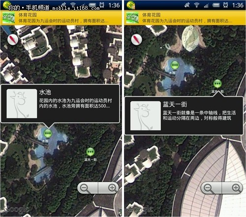 當(dāng)點擊“體育花園”景點時,會自動放大該景點在地圖的位置。此時,在景點這一級別的信息中還推送了下一級信息,就是我們剛才提到的POI信息點,點擊進(jìn)入是2個小POI點的信息—水池、藍(lán)天一街,由下圖我們可以清楚的看到這2個POI點的深度介紹,這就是朋游風(fēng)景第二個Lo的應(yīng)用,提供了本地化景點的深度POI信息,用戶即使是簡單游玩也能深層次的了解景區(qū)故事,不枉此行。