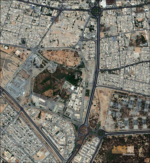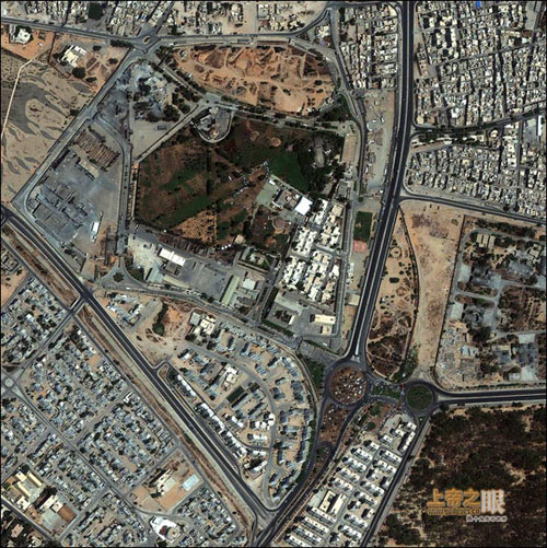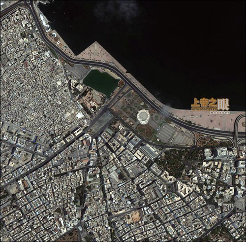 當(dāng)?shù)貢r間2011年8月22日下午12時38分。DigitalGlobe公司的Worldview-2(視界-2)衛(wèi)星拍攝到的烈士廣場(原綠色廣場)。利比亞反對派在攻入首都的黎波里后,已經(jīng)將市中心的綠色廣場改名為“烈士廣場”,在圖中的右上角可見。