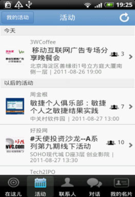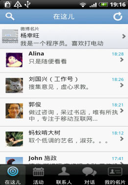 移動互聯(lián)網(wǎng)應用軟件目前種類繁多,其中LBS類的就不少。但目前的LBS類軟件不是以“簽到”為主,就是以“把妹”為主,真正偏重日常職業(yè)社交、商務應用的軟件只有在這兒IM——它不僅聚集了其他軟件所有的功能,還具備別的軟件所沒有的功能,電子名片交換、同城活動聚集、個人身份多重設定以應對不同場合等等。