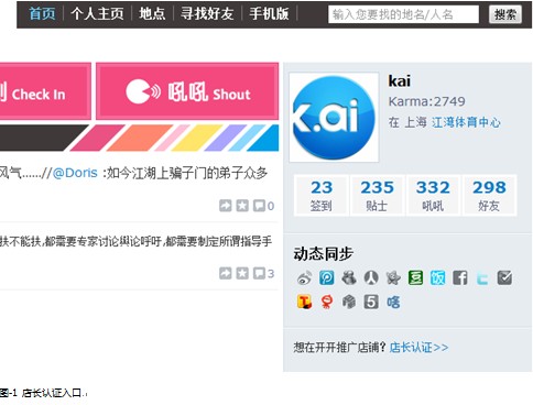 商戶平臺(tái)功能的推出,使本地商戶在該平臺(tái)上進(jìn)行自我線上營銷。本地商戶在開開首頁及地點(diǎn)頁面點(diǎn)擊進(jìn)入“店長認(rèn)證”在線登記提交認(rèn)證申請(qǐng),認(rèn)證成功后在地點(diǎn)頁面顯示本地店長。店長對(duì)店鋪有管理權(quán),可以對(duì)店鋪進(jìn)行描述、上傳圖片、設(shè)計(jì)、發(fā)布適合店鋪的優(yōu)惠信息等,并可以針對(duì)店鋪實(shí)際營運(yùn)情況隨時(shí)修改和調(diào)整優(yōu)惠內(nèi)容。