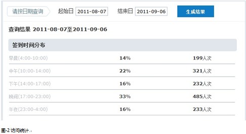 除自身營銷功能外,認(rèn)證后的店鋪基于開開商戶平臺(tái)通過后臺(tái)數(shù)據(jù)的查閱,可以清楚的獲取區(qū)域地理位置內(nèi)到店消費(fèi)群體的習(xí)慣,查看簽到次數(shù)和簽到人數(shù),以及最新簽到的20位用戶。針對(duì)消費(fèi)群體屬性,商戶更是可以自定義時(shí)間段。