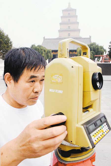 宋成林使用儀器對(duì)大雁塔的傾斜度進(jìn)行測(cè)量