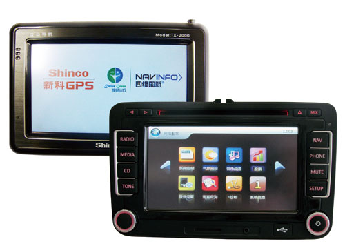 左上為新科PND開機界面,右下為偉世通Telematics服務界面(3sNews 配圖)