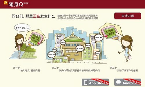 隨身Q的服務(wù)類型是LBS+微博問答,最大的特色是基于位置上的問答。這可能也是與飄信/區(qū)區(qū)小事/對角這些LBS應(yīng)用的一些區(qū)別吧。AppStore和Android版本可能同時(shí)上線。