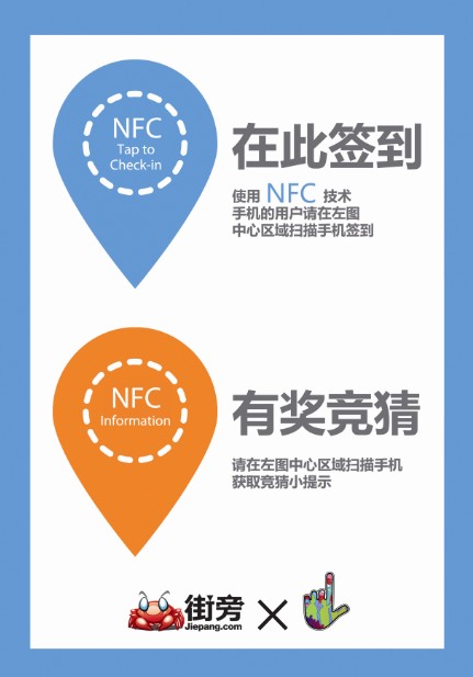 5組創(chuàng)意團(tuán)體及個人受邀運用街旁網(wǎng)NFC技術(shù)簽到廣州城中30家街旁網(wǎng)合作商戶,每簽到一個地點時就能獲取下一個簽到地點信息,得到一個有趣的任務(wù)并顯示在手機(jī)屏幕中,信息交流全程均通過具有NFC功能的手機(jī)實現(xiàn)。