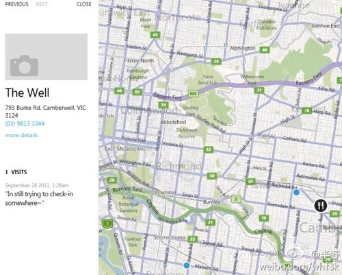初步試用了一下 Microsoft Scrapbook,簡單的不能在簡單。一張 Bing 地圖,上面有一些點點,這些就是曾經(jīng)用戶簽到過的地方。地圖上會有基本的地區(qū)信息,但數(shù)據(jù)好像是引用自 Facebook 的。點擊簽到過的地點,會顯示地址和電話,但點 More 就會跳轉(zhuǎn)到 Facebook 的地點頁面。而且從具體簽到也證實了只有同步到 Facebook 的簽到才能被記錄到 Scrapbook,那些只單一同步到 Windows Live 和 推特 的記錄是沒有的。