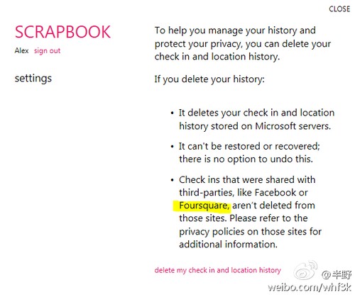 而當(dāng)前設(shè)置選項也非常單一,在 Settings 中只有刪除歷史記錄一個選項。不過在文字介紹中稍微有了一些端倪,說刪除 Scrapbook 歷史記錄,并不會對第三方網(wǎng)站如 Facebook 或 FourSquare 造成影響。這讓我們非常期待 WP7 手機(jī)上有更多 LBS 的支持,或者說 Scrapbook 是一個能聚合眾多 LBS 記錄的網(wǎng)站。我個人更傾向于后者,以后 Facebook,F(xiàn)ourSquare,Jiepang,等亂七八糟的簽到都能按時間順序依次顯示在我的 Scrapbook 地圖中,也是一個有意思的事。