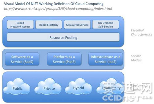 NIST對(duì)云計(jì)算的定義:云計(jì)算是一個(gè)模型,這個(gè)模型可以方便地按需訪問(wèn)一個(gè)可配置的計(jì)算資源(例如:網(wǎng)絡(luò)、服務(wù)器、存儲(chǔ)設(shè)備、應(yīng)用程序以及服務(wù))的公共集。這些資源可以被迅速提供并發(fā)布,同時(shí)最小化管理成本或服務(wù)提供商的干涉。云模型由五個(gè)基本特征、三個(gè)服務(wù)模型和四個(gè)發(fā)布模型組成,如下圖所示。