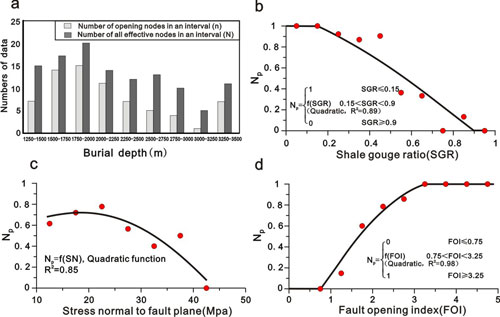 圖1:(a)不同埋深區(qū)間內(nèi)斷層開啟數(shù)據(jù)點(diǎn)數(shù)量n與所有數(shù)據(jù)點(diǎn)數(shù)量N的統(tǒng)計(jì)結(jié)果,利用這些數(shù)據(jù)計(jì)算各區(qū)間的斷層連通概率(Np=n/N);斷層連通概率(Np)與泥巖涂抹因子(SGR)(b)、斷層面正應(yīng)力(SN)(c)和斷層開啟指數(shù)(FOI)(d)的統(tǒng)計(jì)關(guān)系表明,綜合參數(shù)能夠有效表征油氣運(yùn)移過程中的斷層啟閉性。
