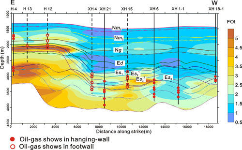 圖2:斷層開啟系數(shù)在斷面垂直方向上的拓?fù)浞植寂c斷層兩盤儲(chǔ)層內(nèi)的油氣顯示;垂直線是鉆井投影,實(shí)線表示鉆井位于斷面的前部,虛線表示鉆井位于斷面的后部;紅色實(shí)心圓代表斷層上盤地層內(nèi)的油氣顯示,空心圓代表斷層下盤地層內(nèi)的油氣顯示;水平線是地層單元在斷面上的投影,實(shí)線表示上盤地層,虛線表示上盤地層。