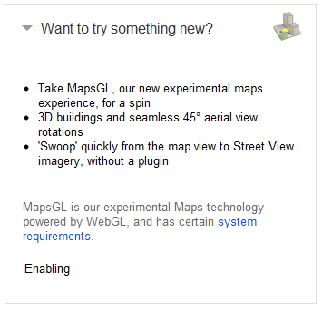 如果你喜歡Google Maps for Android那遠(yuǎn)比桌面版流暢的界面,那么現(xiàn)在是時候嘗試新事物了。如果你使用Chrome 14+或Firefox 8+瀏覽器,且顯卡支持WebGL標(biāo)準(zhǔn),那么現(xiàn)在打開Google Maps即可在左側(cè)看到一個提示:“Want to try something new?”,點(diǎn)擊之后Google Maps就不會再使用Flash技術(shù)來顯示街景了,而換用WebGL(Google稱其為MapGL),且可顯示出跟Android手機(jī)上一樣的3D地圖界面。
