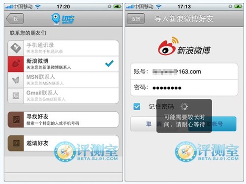 登陸后好友搜索功能也是非常強大,傳統(tǒng)的手機聯(lián)系人和Email聯(lián)系人和微博好友都可以搜到。