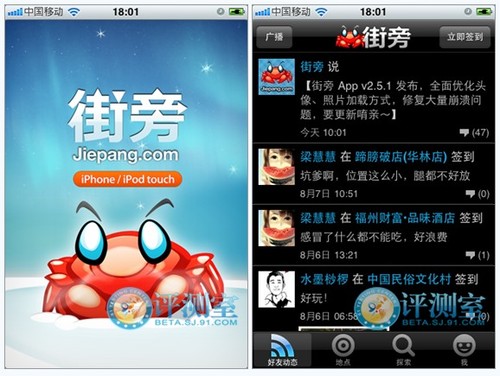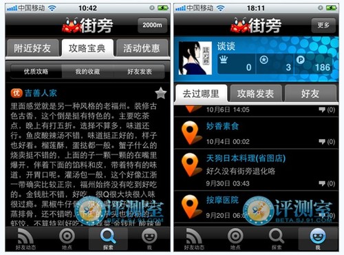 從界面上來看街旁雖然沒有什么復(fù)雜的功能但是排版和字體都很清晰,功能按鍵符合用戶使用習(xí)慣。簽到地點附帶地圖和攻略寶典,評論比較詳細,特別是餐廳對想要光顧的用戶提供了不錯的參考意見。