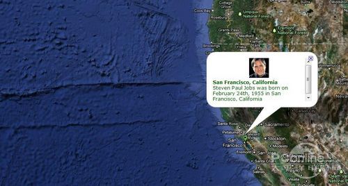 Google Maps Mania最近利用Google Earth制作了一個(gè)名為Steve Jobs" Journey of Life的應(yīng)用,讓你在地圖中看到Steven Jobs一生中幾個(gè)重要的位置點(diǎn),它以動(dòng)態(tài)跳轉(zhuǎn)的形式將喬布斯的一生一一展現(xiàn)在你的眼前。