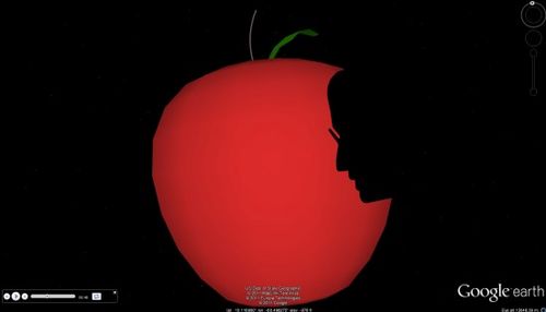 無(wú)獨(dú)有偶,近日,Steven Ho利用在Google Earth制作了一個(gè)3D模型。整個(gè)地球逐漸被一顆蘋(píng)果吞噬,而蘋(píng)果又在右上方被要掉一角。咬掉的一角就是喬布斯的側(cè)臉輪廓。視頻做的是比較簡(jiǎn)單,不過(guò)貴在創(chuàng)意還不錯(cuò)。