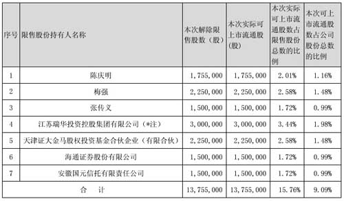 注:江蘇瑞華投資控股集團(tuán)有限公司原名為江蘇瑞華投資發(fā)展有限公司,其所持的3,000,000股份本次解禁流通時(shí)尚處于質(zhì)押凍結(jié)狀態(tài)。