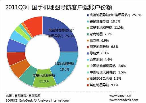 綜合EnfoDesk易觀智庫產(chǎn)業(yè)數(shù)據(jù)庫《2011年第3季度中國手機(jī)地圖客戶端市場監(jiān)測報告》和《2011年第3季度中國手機(jī)導(dǎo)航客戶端市場監(jiān)測報告》數(shù)據(jù),高德軟件、谷歌及諾基亞分別占據(jù)中國手機(jī)地圖導(dǎo)航客戶端用戶市場前三名的位置(中國“手機(jī)地圖客戶端+手機(jī)導(dǎo)航客戶端”的整體市場份額)。