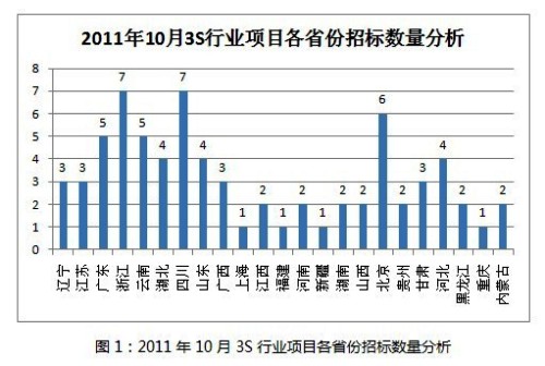 10月份有23個(gè)省進(jìn)行了與3S行業(yè)相關(guān)的公開(kāi)招標(biāo),由于整體招投標(biāo)數(shù)量減少,可以看出本月各省份的招標(biāo)信息均不到10條,但與上月相同,浙江省依舊穩(wěn)居第一,四川與之并列,兩省均為7條,其次為北京、廣東、云南,其余各省具體數(shù)量如圖1所示。