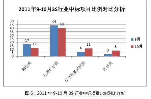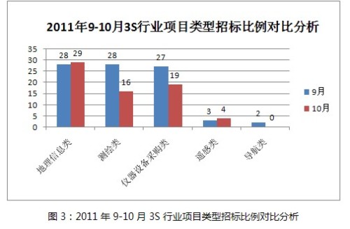 由圖2顯示的10月份3S行業(yè)項(xiàng)目類(lèi)型招標(biāo)比例整體情況看,地理信息類(lèi)項(xiàng)目比例有所增長(zhǎng),而測(cè)繪類(lèi)、儀器設(shè)備采購(gòu)類(lèi)均略有下降,但通過(guò)兩個(gè)月的數(shù)量對(duì)比(圖3)可以看出,實(shí)際上測(cè)繪類(lèi)和儀器設(shè)備采購(gòu)類(lèi)下降比例較大,而地理信息類(lèi)與上月相差無(wú)幾。