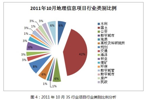 10月份涉及到的行業(yè)共計(jì)16個(gè),基本全部為傳統(tǒng)行業(yè),國(guó)土的比例又進(jìn)一步提升,由9月份的30%上升至42%,而以往一直占有較大比例的水利在本月情況并不十分理想,僅占6%。2012年就是第一次全國(guó)水利普查的結(jié)束之年,根據(jù)普查進(jìn)度,截至2011年12月份,應(yīng)該完成清查登記階段。因此隨著前期儀器設(shè)備的采購(gòu)工作的結(jié)束以及為后續(xù)數(shù)據(jù)處理等流程的準(zhǔn)備工作逐漸完成,相信接下來(lái),水利方面的項(xiàng)目會(huì)逐漸減少。