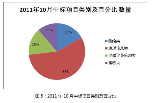 10月份各項(xiàng)目類(lèi)別的中標(biāo)信息中,地理信息類(lèi)仍占主要地位,比例超過(guò)一半以上,其他測(cè)繪類(lèi)、儀器設(shè)備采購(gòu)類(lèi)、遙感類(lèi)三部分分布相對(duì)均勻。從數(shù)量對(duì)比來(lái)看,9、10月份相差不大,僅略有浮動(dòng)。