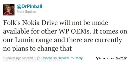 很顯然,對于駕駛導航被破解的事情,諾基亞已經(jīng)有所耳聞。今天該公司公關(guān)部門主管在Twitter上表示,不會也不計劃讓Nokia Drive與其它廠商共享,并聲稱會盡全力制止一切移植他們特色服務(wù)的活動。