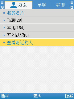 Symbian系統(tǒng)版本除了增加可以將信息轉(zhuǎn)發(fā)給飛信或者飛聊好友的“轉(zhuǎn)發(fā)”功能外,為了方便用戶對(duì)溝通對(duì)象的查找,還按照名稱首字母進(jìn)行排序進(jìn)行了“好友列表”排序優(yōu)化。